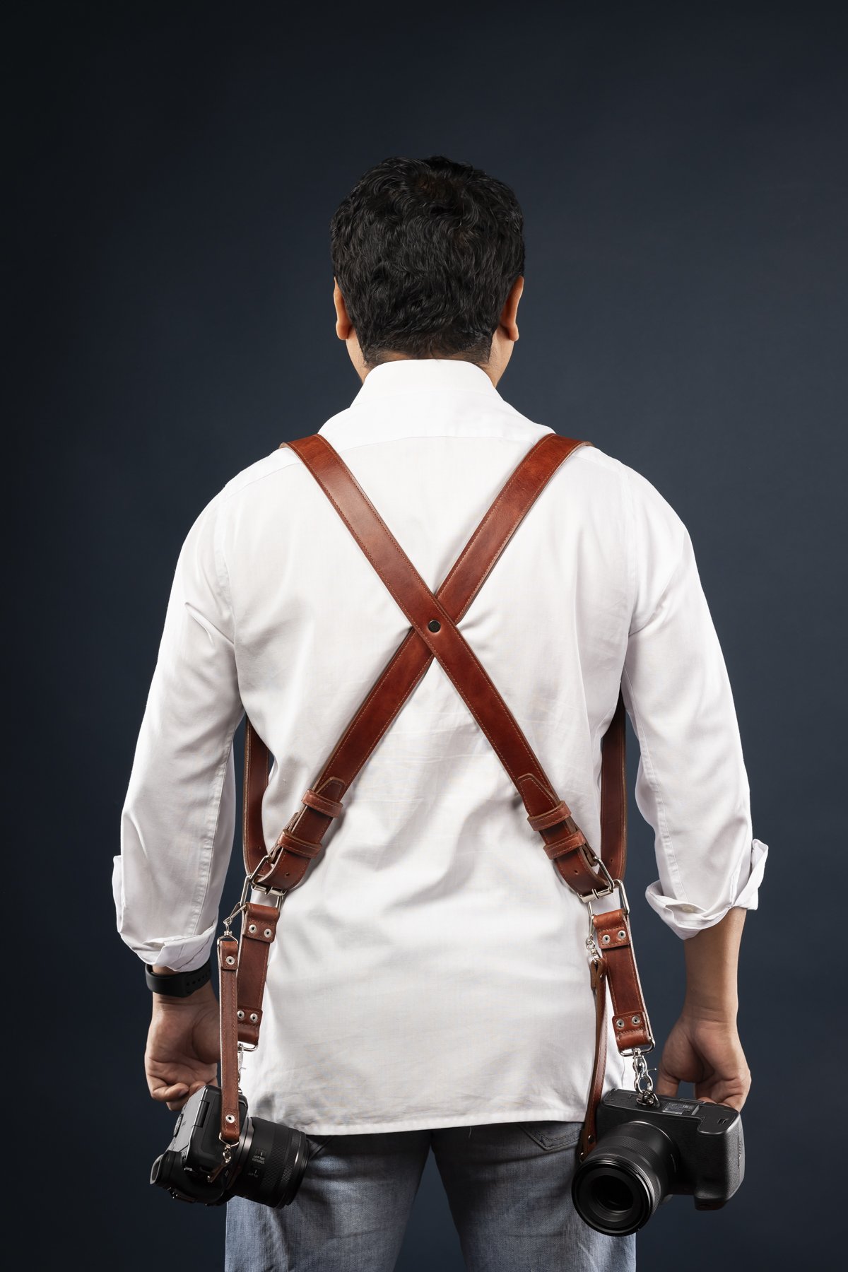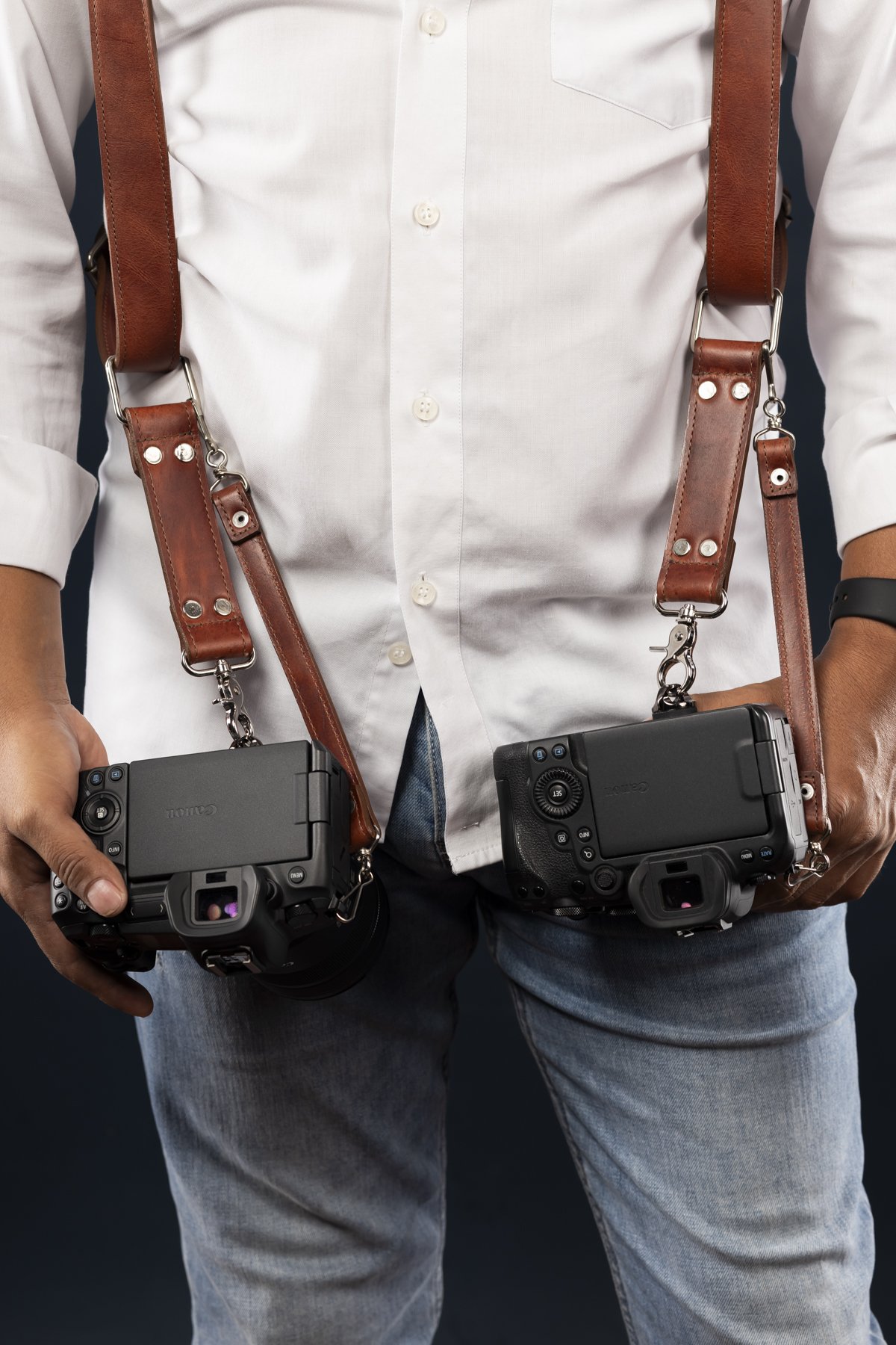 INCLUYE: Correa de cuero, tornillo universal para todas las marcas de cámaras profesionales con sus respectivos mosquetones.